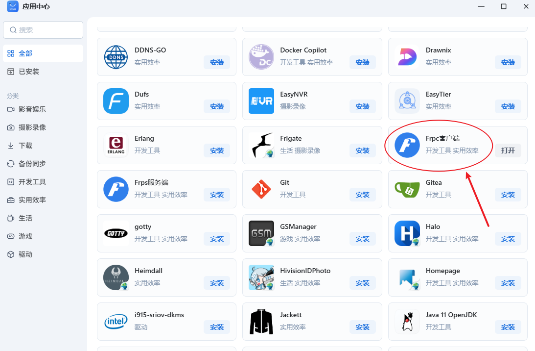 1、在飞牛的应用中心安装Frpc客户端